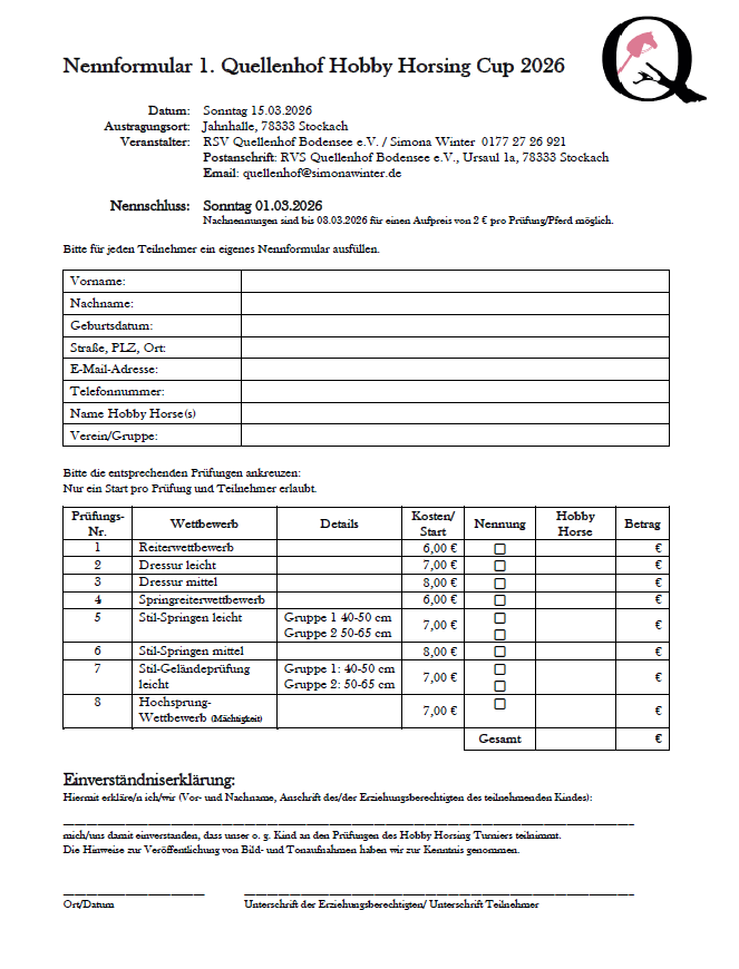 Mit dem absenden des Anmeldeformulars werden sie zur Email Liste zum Thema Hobby Horsing hinzugefügt. Sie bekommen ausschließlich Informationen die das Hobby Horsing vom Quellenhof angehen